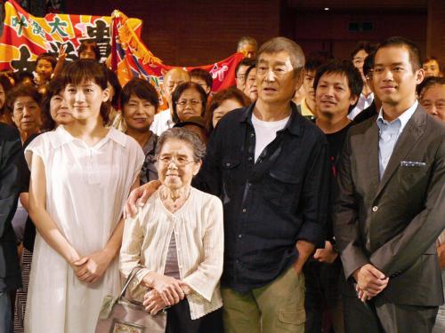 長崎県平戸市で開かれた映画「あなたへ」の上映会で、市民に囲まれる(左から)綾瀬はるか、(1人おいて)高倉健、三浦貴大ら出演者