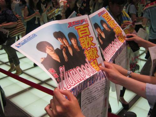 サプライズ発表で興奮冷めやらぬファン5000人が熱心に見入っていた。号外は21日から、タワーレコードやHMV各店など、全国のレコード店の店頭に数量限定で置かれる。