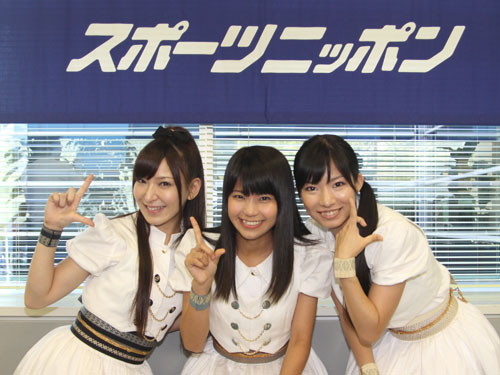 スポニチを訪問した「LinQ」の(左から)上原あさみ、天野なつ、岸田麻佑