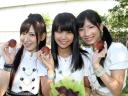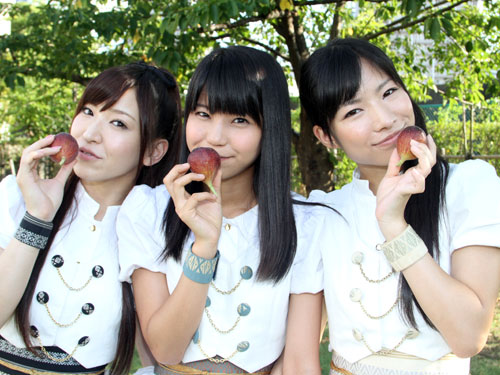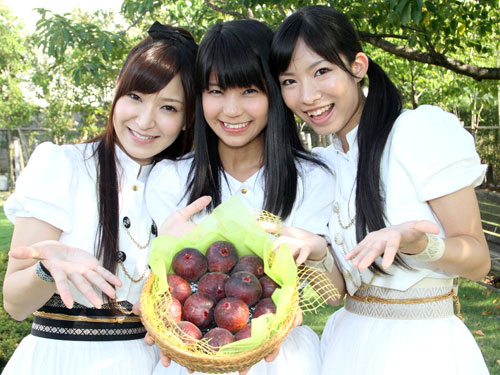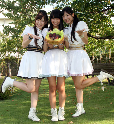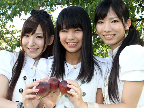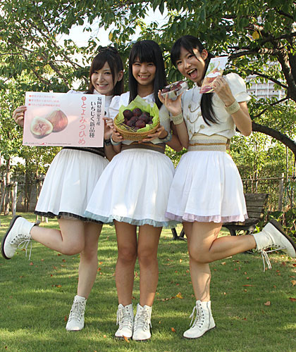 福岡県限定生産いちじく「博多とよみつひめ」をPRする「LinQ」の(左から)上原あさみ、天野なつ、岸田麻佑