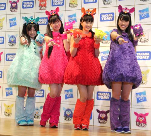 10月に新商品を発売し、米国から再上陸する次世代型電子ペットぬいぐるみ「ファービー」。イメージキャラクターに就任したももクロが各色のファービーのコスプレ衣装で登場した。