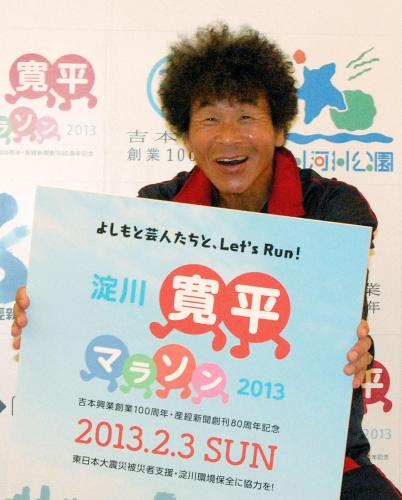 タレント間寛平(63)をホスト役に来年2月3日、東日本大震災の被災地支援などを目的に「淀川寛平マラソン2013」が大阪府・淀川河川敷で開かれることになった。1万人以上の市民ランナーの参加を募る計画。大阪市内で24日記者会見した間は「触れ合いのある楽しいマラソンにしたい」と語った。
