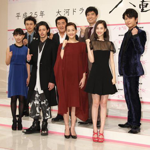 意気込みを見せるNHK大河ドラマ「八重の桜」出演者(前列左から)谷村美月、オダギリジョー、綾瀬はるか、水原希子(後列左から)勝地涼、松方弘樹、高嶋政宏、及川光博
