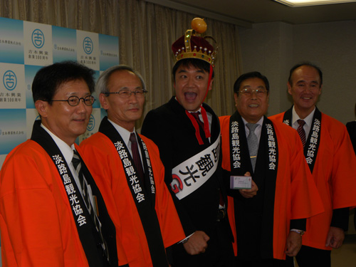 竹内通弘洲本市長に「島に住んで」と懇願され、戸惑いながらも「住めますよ」と返答。本職のお笑いよりも力が入っている様子に、観光協会の木村幸一副会長からは「人気がなくなったら首を切ります」とクギを刺され、「はっきり言うね」と苦笑いだった。