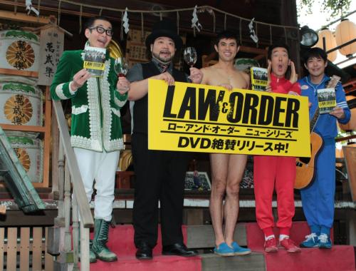 「LAW&ORDER/ロー・アンド・オーダー」のロングヒット祈願を行った(左から)「髭男爵」のひぐち君、山田ルイ53世、小島よしお、「テツandトモ」のテツ、トモ