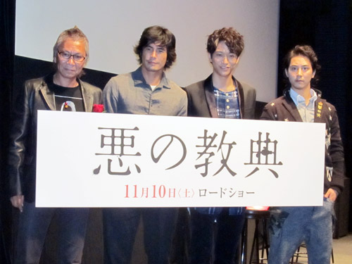 映画「悪の教典」トークイベントに出席した(左から)三池崇史監督、伊藤英明、浅香航大、KENTA