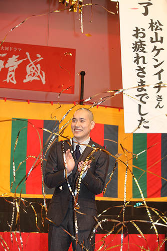 松山は「人と人とのつながりが自分の中でのテーマ。清盛に重要なことを教えていただいた気がする。ここまで濃密に人と関わりあって仕事ができたことは自分にとって貴重な経験。全身全霊をかけてスタッフ、キャストにぶつかって行けたことは一生忘れられない経験になった」と目を潤ませながら、あいさつした。