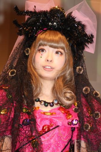 黒いベールの上にリボンを乗せ、自身がデザインしたピンク色のウエディングドレス姿で登場。コンセプトは“蜘蛛(くも)の嫁入り”で、網には本物のキャンディーがからまっているオリジナリティあふれるドレス。「お菓子が取れるのでどうぞ」と記者にプレゼントする場面もあった。ウエディングを着たのは意外にもこれが初めて。将来的には?との質問には「真っ白っていうよりは、どこかにパンチが効いたウエディングドレスにしたい」と理想を語った。