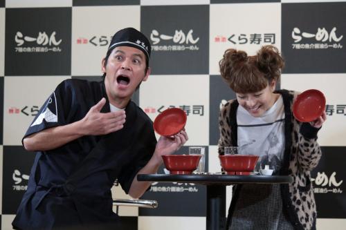 お笑いコンビ「ますだおかだ」の岡田圭右(43)が1日、都内で行われた大手回転寿司チェーン「くら寿司」の新商品「7種の魚介醤油らーめん」発売イベントに出席した。