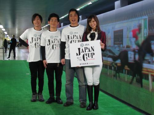 JRA「ジャパンカップ競走」開催記念キャンペーン発表会に出席した(左から)「ジャングルポケット」武山浩三、太田博久、斉藤慎二、優木まおみ