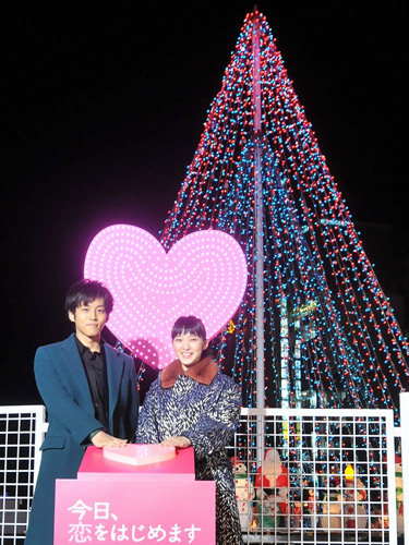 映画「今日、恋をはじめます」(監督古澤健、12月8日公開)に主演する2人の合図で、42万個の電球が一斉に点灯。81年から続く日本一歴史があるイルミネーションイベントの点灯式にゲストが登場したのは初めて。