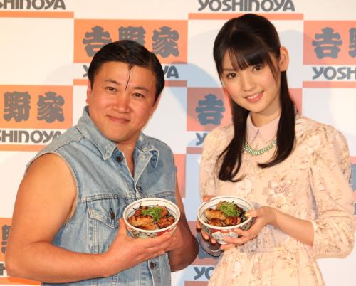 お笑い芸人のスギちゃん(39)と「モーニング娘。」の道重さゆみ(23)が27日、都内で行われた「吉野家」新商品記者発表会に登場した。