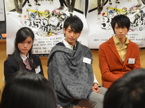 3人が共演する舞台「3150万秒と、少し」の内容にちなみ、「生きること」をテーマに討論。美山ら同校の生徒と秋元が将来の夢や高校生活の悩みなどを語り、小澤と相葉らが“先輩”として答える形で進んだ。