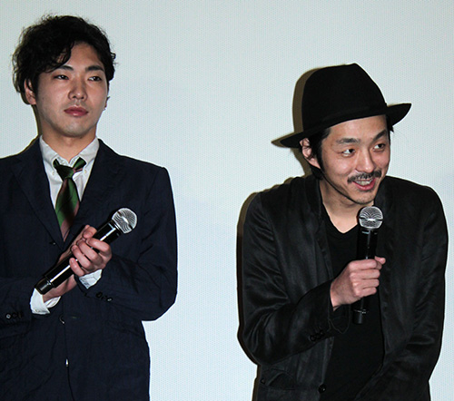 映画「大奥~永遠~[右衛門佐・綱吉編]」初日舞台あいさつに登壇した宮藤官九郎。左は柄本佑