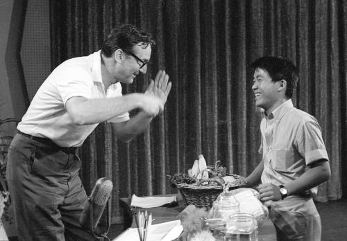 1963年8月、テレビ番組のリハーサルで、スティーブ・アレンさん(左)と話す坂本九さん