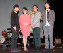 満員の観客をバックに記念撮影した(左から)松本哲也、石垣佑磨、鈴木砂羽、中村大哉監督