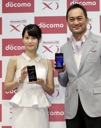 NTTドコモが発表した春商戦向けのスマートフォンを手にする堀北真希と渡辺謙