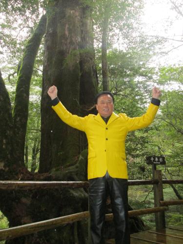 屋久島の世界遺産登録20周年記念曲「屋久島」を歌う細川たかし。樹齢1000年以上の「千年杉」の前でガッツポーズ
