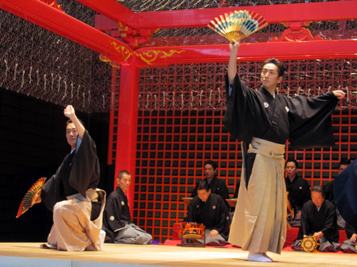 羽田空港国際線ターミナルの「江戸小路」で舞踊を披露する中村勘九郎(左)七之助兄弟