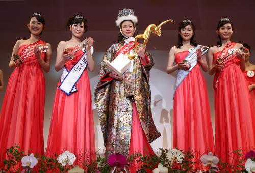 ミス日本グランプリに選ばれた鈴木恵梨佳さん(中央)が拍手を受ける