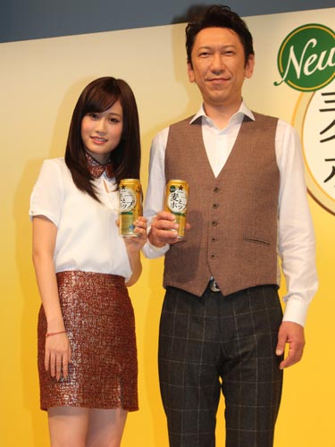 サッポロ「麦とホップ」新CM」発表会に登場した前田敦子(左)と布袋寅泰