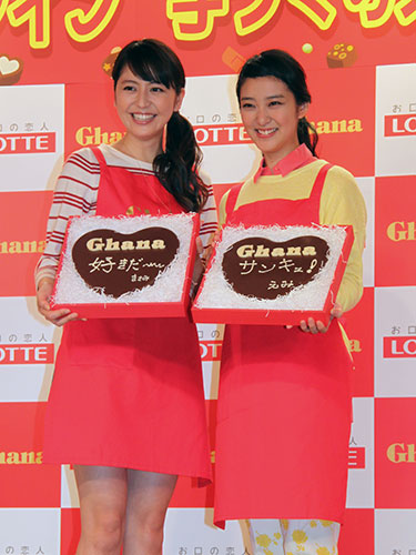女優の長澤まさみ(25)と武井咲(19)が6日、都内で行われた「ガーナ バレンタイン手づくりステーション」オープニングイベントに出席した。