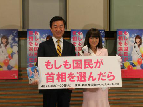前神奈川県知事の松沢成文氏(54)の同名小説が原作。首相公選制となった日本で初の女性首相が誕生するまでを描く。実際に“美人過ぎる総理大臣”になったらとの質問に「グレーの建物が多い日本をカラフルにしたい」と笑顔で話した。4月24日から東京・代々木の全労済ホールで上演。