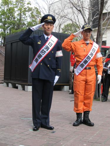 歌舞伎俳優の中村勘九郎(31)と、弟・中村七之助(29)は4日、東京・赤坂消防署の一日消防署長を務めた。勘九郎は消防、七之助はレスキュー隊の制服に身を包み、赤坂サカス(港区)で行われた消防演習に参加。放水訓練などを指揮した。