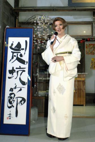 おもむろに「炭坑節」と大書きした書道作品を披露。「『月が出た出た』と盆踊りで踊っていました。五十の手習いで先生について勉強しています。メークが本業ですので、筆遣いは良かったみたい」と胸を張った。