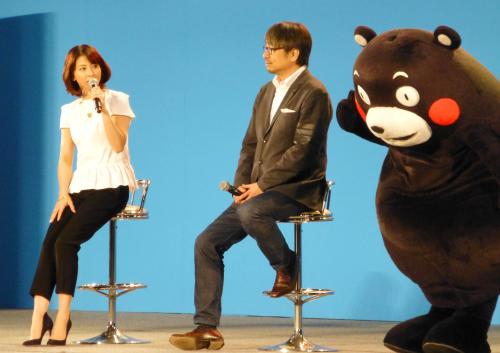 熊本県のキャラクター「くまモン」の誕生祭に登場した森高千里(左)と小山薫堂さん