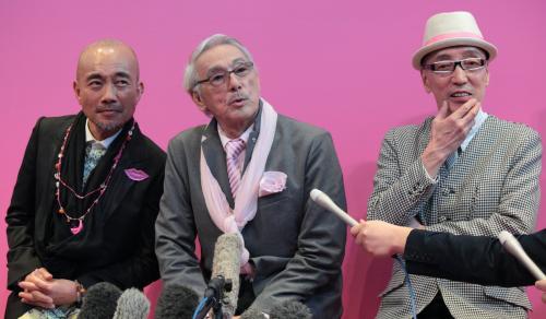 演出家のテリー伊藤氏(63)や、俳優の竹中直人(57)ら著名人10人とともに「ピンククラウンが似合う、愛されオヤジ」に選ばれ、ライトグレーのジャケットに、ピンク色のネクタイとバスケットシューズという“チョイ悪”姿で登場。車を気に入ったようで、トークショーでは「値段はいくらですか?今(家が)焼けて大変なんですよ」と自虐ネタを披露。さらに「(俳優仲間からの)お見舞金が凄いんだよ。2台ぐらいは買える」と周囲の笑いを誘った。