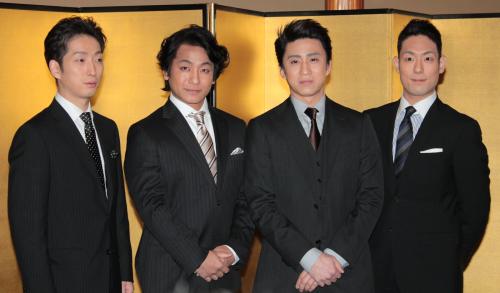 「明治座 五月花形歌舞伎」(5月3日から27日)の製作発表が21日、都内で行われ、歌舞伎俳優の市川染五郎(40)、片岡愛之助(41)、中村勘九郎(31)、中村七之助(29)が出席した。