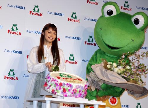 「わたしにも、自然にも、気持ちいい。」がキャッチコピーの「フロッシュ」は世界40カ国以上で愛されている自然にやさしい食器用洗剤。「環境への配慮」「洗浄力」「手肌へのやさしさ」をバランスよく備えており、今回、日本発売1周年。宮崎は、マスコットキャラクター「フロッシュくん」とともにケーキカットと花束贈呈を行い「(フロッシュは)毎日使うものだし、手肌にも、環境にもやさしいのでぜひ使ってください」とPRした。