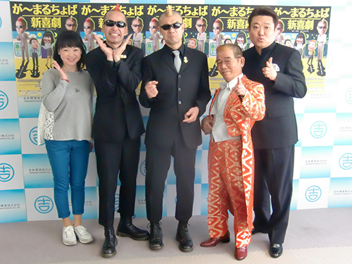 会見で笑顔を見せる(左から)未知やすえ、「が~まるちょば」のケッチ!、HIRO―PON、池乃めだか、烏川耕一