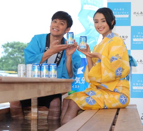 お笑いコンビ「ますだおかだ」の岡田圭右(44)と、ミス・ユニバース・ジャパン神奈川県代表の下垣実夏子さん(20)が24日、神奈川・海老名サービスエリアで行われたサントリー酒類「のんある足湯Garden in 海老名サービスエリア」発表会に出席した。