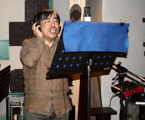 デビュー曲「勉強しようぜ」のレコーディングで熱唱する陰山英男さん=3月、東京都内(グリオ提供)