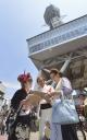 大阪・通天閣の地下劇場の存続を訴え、劇場周辺で署名活動をする歌手の叶麗子