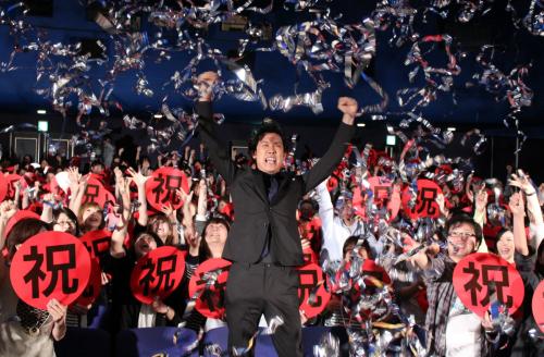 大泉は、客席通路を歩いて壇上に上がると大きな身振りを交え「どうもありがとう」と連呼。11日の公開以来、ヒットを支える観客に何度も頭を下げ感謝した。初日には元AKB48の前田敦子(21)とAKB48の峯岸みなみ(20)が同映画を観賞したと話し、ニッコリ。しかし、前田主演のホラー映画「クロユリ団地」に興行成績ランキングで抜かれたことには、「負けちゃいました。ガッカリしました」と苦笑いを見せた。