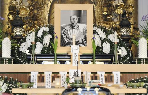 弔辞で、大蔵流狂言師で人間国宝の山本東次郎さんが「舞台はまさに天衣無縫、自由闊達。天性の喜劇役者だった」と功績をたたえた。哲学者の梅原猛さんは「あなたの笑いに希望を与えられた日本人を代表してお礼を言いたい」と述べた。