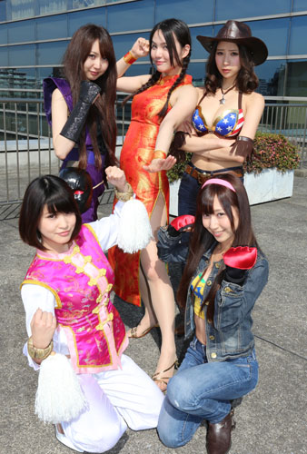 くのいちや女子プロレスラーなどのヒロインが屈強な男性たちを倒していく格闘ゲームをパチンコ化。5人は「華麗なバトルが繰り広げられます」とキャラクターのコスプレ姿でアピールする。