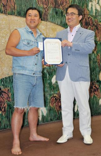 「LOVEあいちサポーターズ あいちワイルド大使」に就任したお笑いタレントのスギちゃん。右は大村秀章愛知県知事