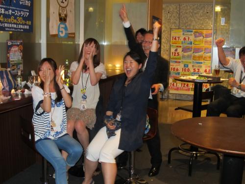 7階のバー「ラパン」には残業中の社員約50人が集まり、全員がガッツポーズ。サムライブルーのタオルなどを手にした社員は、「テレ朝!テレ朝!」と連呼し、「ブラジルに行くぞー!」と絶叫。お祝いのシャンパンで乾杯し、終了間際の同点劇に酔いしれた。