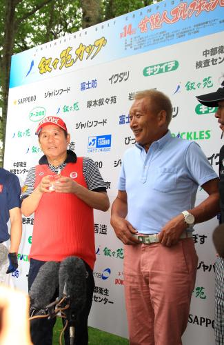 ホールアウト後、報道陣の質問に答えるビートたけし(左)とビートきよし
