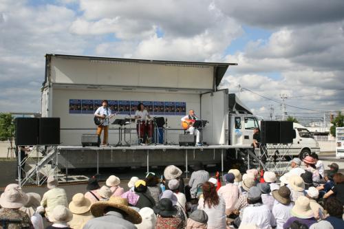気温30度を超える日差しのもと、トラックに設置されたステージに上がった3人。谷村、堀内はアコースティックギター、矢沢はコンガを叩く構成。アリスの原点ともいえるシンプルなスタイルで、「チャンピオン」「遠くで汽笛を聞きながら」「冬の稲妻」など9曲を歌唱。原発事故で富岡町や川内村などから避難している約400人を激励した。