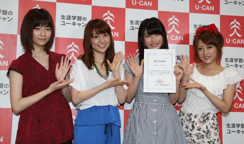 調剤事務管理士試験に合格した横山由依(右から2人目)は認定証を手に(左から)島崎遥香、大島優子、高橋みなみに祝福され笑顔