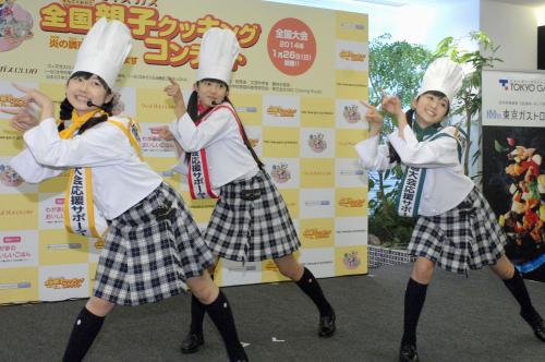 アイドルグループ「さくら学院」の菊地最愛(13)、田口華(13)、水野由結(13)が18日、都内で行われた「ウィズガス 全国親子クッキングコンテスト」参加者募集の記者発表会に出席した。