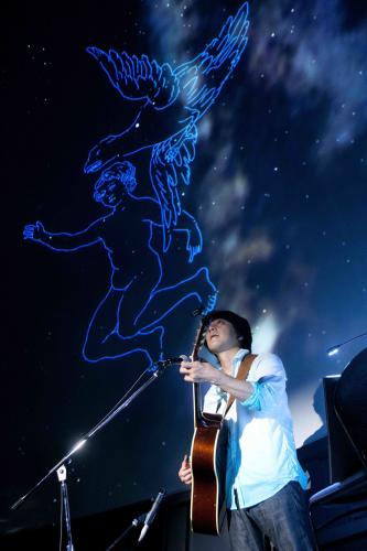 プラネタリウムで再現された天の川の下で歌う山崎まさよし