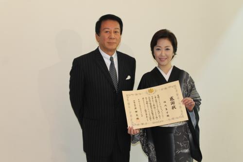 岸田外務大臣からもらった感謝状を手に笑顔の伍代夏子と杉良太郎