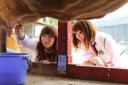 世界文化遺産に登録されたばかりの富士山を見上げる静岡県富士宮市で28日、AKB48の梅田彩佳(24)、野中美郷(22)が一日観光大使を務めた。