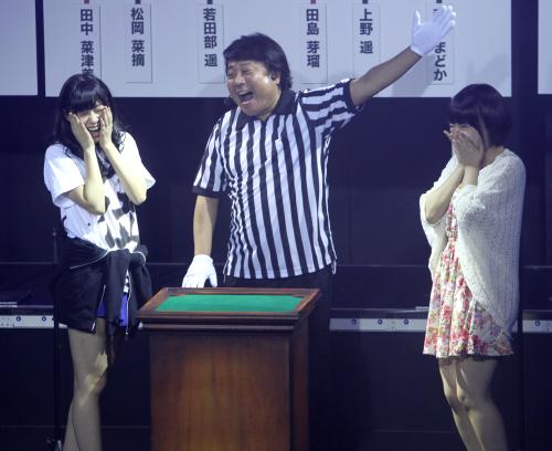 AKB48じゃんけん大会・HKT48予備戦Aブロック決勝で研究生の朝長美桜に敗れた指原莉乃(左)